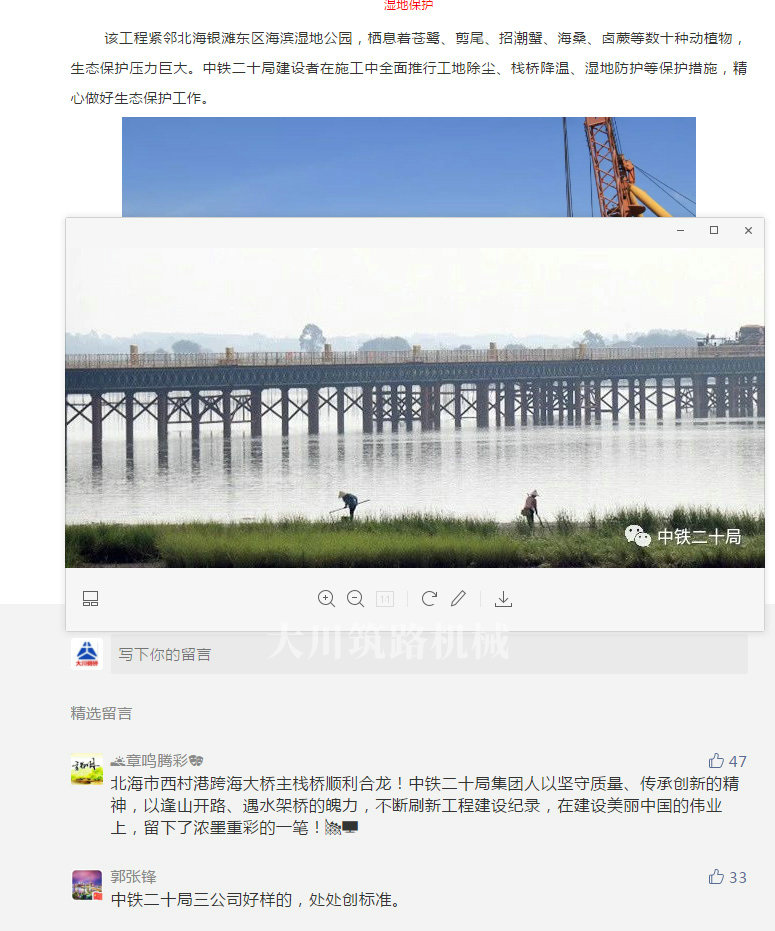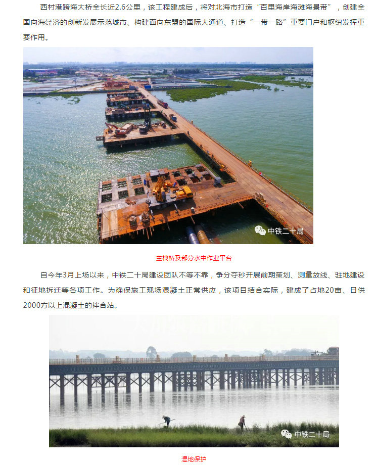 該工程緊鄰北海銀灘東區(qū)海濱濕地公園,棲息著蒼鷺、剪尾、招潮蟹、海桑、鹵蕨等數(shù)十種動植物,生態(tài)保護壓力巨大。中鐵二十局建設(shè)者在施工中全面推行工地除塵、棧橋降溫、濕地防護等保護措施,精心做好生態(tài)保護工作。